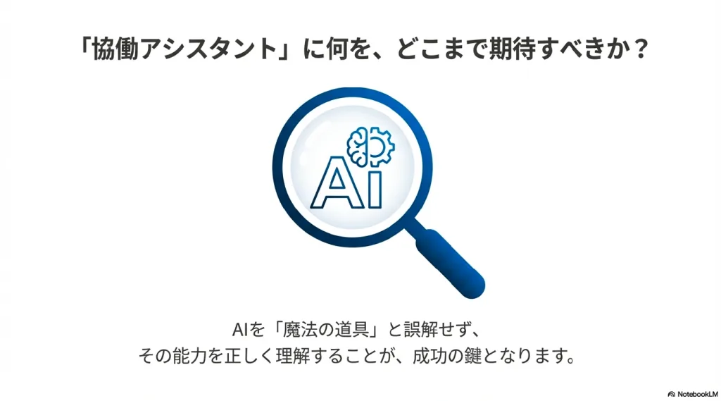 - 適切な期待値設定がAI活用の成功条件の基盤